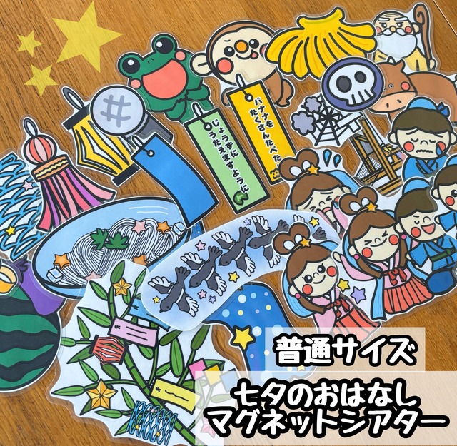 ご覧頂きありがとうございます❁ 七夕のお話のマグネットシアターです☆ 織姫と彦星はどうして1年に一度しか会えないの? 七夕飾りにはどんな意味があるの? 織姫と彦星のお話し 七夕飾りの名前とそれぞれの意味 七夕の食べ物や飾るもの 台本に沿ってホワイトボードにペタリと貼って説明する事が出来ます。 おサルさんとカエルさんの短冊で願い事の例もお話し出来ます♪ 【セット内容】 織姫(笑顔と泣き顔)、彦星(笑顔と泣き顔)、織姫と彦星、神様、機織り機、牛、ボロボロ、病気、天の川、かささぎ、笹飾り、飾り(青短冊、提灯、吹き流し、あみ飾り、輪繋ぎ)、さる、さるの短冊、バナナ、カエル、カエルの短冊、マイク、そうめん、スイカとナス 計26個 台本…A4サイズ2枚分 *パーツは全てラミネートしています。 *裏にマグネットシールが付いていますので、お届け後すぐに楽しめます (マグネットの管理には十分ご注意お願いします) *ホワイトボードは28×35のサイズを使用しています。  大きさの参考にして下さい  (ホワイトボードは含まれていません) A4サイズに印刷しています ●追加¥250で拡大サイズに変更可能です →オプションからお選び下さい ●追加¥500で特大サイズに変更可能です →オプションからお選び下さい (変更は、拡大 or 特大どちらかを選択して下さい) ●丁寧にお作りしていますが、素人のイラスト、カット作成ですので、ゆがみなどご了承ください ●印刷は家庭用インクジェットプリンターで行っています。 画質をご確認頂き、印刷のスレ、スジなどご了承下さい。 ●商品は透明のラッピング袋に入れて、厚紙と一緒に発送させて頂きます。 同じデザインでパネルシアターも出品しています 用途に合わせてお選び下さい ❁ハンドメイドのご理解よろしくお願いします。 #保育教材 #幼稚園 #保育園 #保育実習 #手袋シアター #マグネットシアター #ラミネートシアター #ホワイトボードシアター #ペープサート #七夕